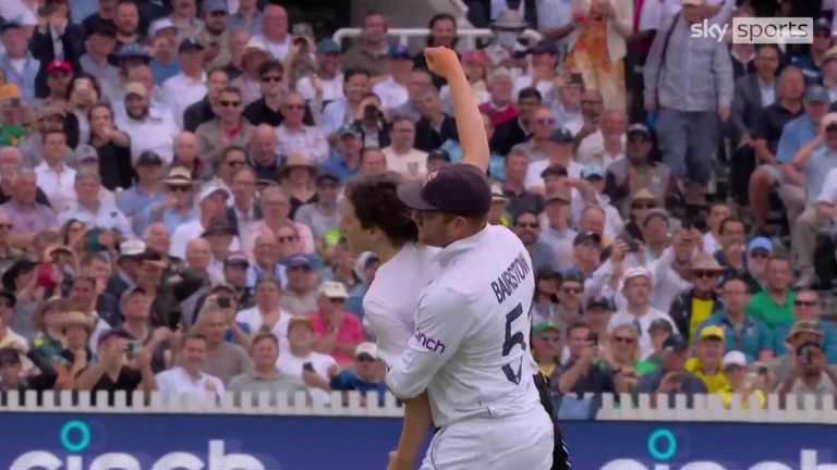 England player Jonny Bairstow carried Knorr off the pitch, while champagne corks and fruit were thrown by cricket fans at Bourne as he was led off the field, and Murray was tackled before she could reach the wicket and held down on the grass.