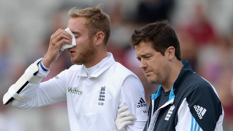 The ball clattered into his helmet and broke through the grill. It ended up being lodged between Broad’s face and the remains of his grill and the Nottinghamshire man was soon on his knees spitting out blood.