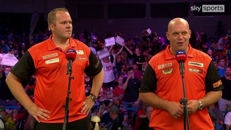 Michael van Gerwen is bidding to win his first World Cup title without Raymond van Barneveld, and Netherlands remain in the hunt for a fifth crown after defeating Singapore in successive singles matches.