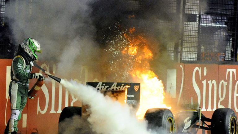 Lotus driver Heikki Kovalainen remained in good spirits despite a disappointing end in Singapore saw his car catch fire.