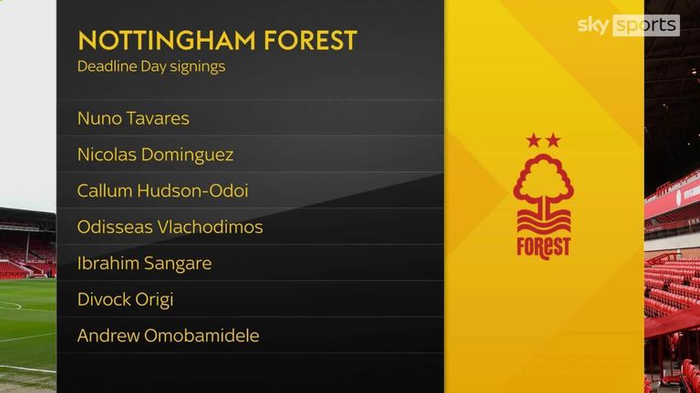 Ibrahim Sangare was Nottingham Forest's most expensive new recruit, joining from PSV Eindhoven for £30m; Divock Origi, Nuno Tavares, Nicolas Dominguez, Callum Hudson-Odoi, Odysseas Vlachodimos, Andrew Omobamidele all arrive at the City Ground