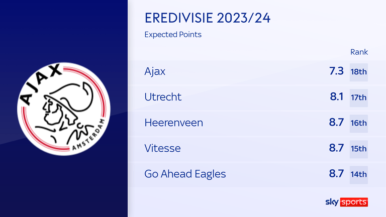 Steijn inherited the youngest squad in the Eredivisie, and the numbers suggest they should really be propping up the league. Ajax have five points from seven games, but in terms of Expected Points, their 7.33 is the worst of any of the 18 clubs.