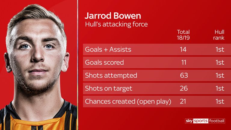 Bowen is the top scorer for Hull this season, having netted 11 times in 26 appearances, he is also his side's chief creator of chances from open play (21) and has attempted more shots and shots on target than of his team-mates.