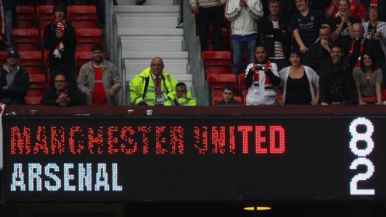I was at Old Trafford to witness Arsenal's biggest ever Premier League defeat, topping the 6-1 at the same stadium in February 2001. Manchester United took their run of home wins to 17 in a row in the Premier League and 19 in all competitions. Wayne Rooney became the 11th Man Utd player to reach 150 goals and overtook Paul Scholes and Ruud van Nistelrooy who both boasted 150 in their careers. He also overtook Ryan Giggs as the club's highest Premier League goalscorer with 107 to the Welshman's 105. His record against Arsenal is 12 goals in 24 games for both Everton and Man Utd and he always seems to do something special against the Gunners. He scored his first Premier League goal and his 100th Premier League goal against them and now his 150th. He also scored on his 19th birthday to famously end Arsenal's 49-game unbeaten run. Ji-Sung Park is another who tends to weigh in against Arsenal and now has five goals in 14 games (all competitions) - a fifth of his entire United total! Ashley Young got his 50th and 51st league goals, while Nani scored his first Premier League goal since the 2-1 win over Man City on February 12; that's13 games without a goal. Danny Welbeck scored United's third Premier League header of the season to continue their fine run in that department. They were the Premier League's top headed goalscorers last term with 18. Robin van Persie scored his third goal against Man Utd, not including his strike in the shoot-out that saw Arsenal win the FA Cup in 2005. However, he couldn't score from the spot on Sunday in what was the eighth penalty in the last nine games between these sides at Old Trafford. United scored five of their six (Rooney with their only miss), while Arsenal failed with both of theirs - Gilberto in 2006 and Van Persie on Sunday.EIGHT INTO FOUR