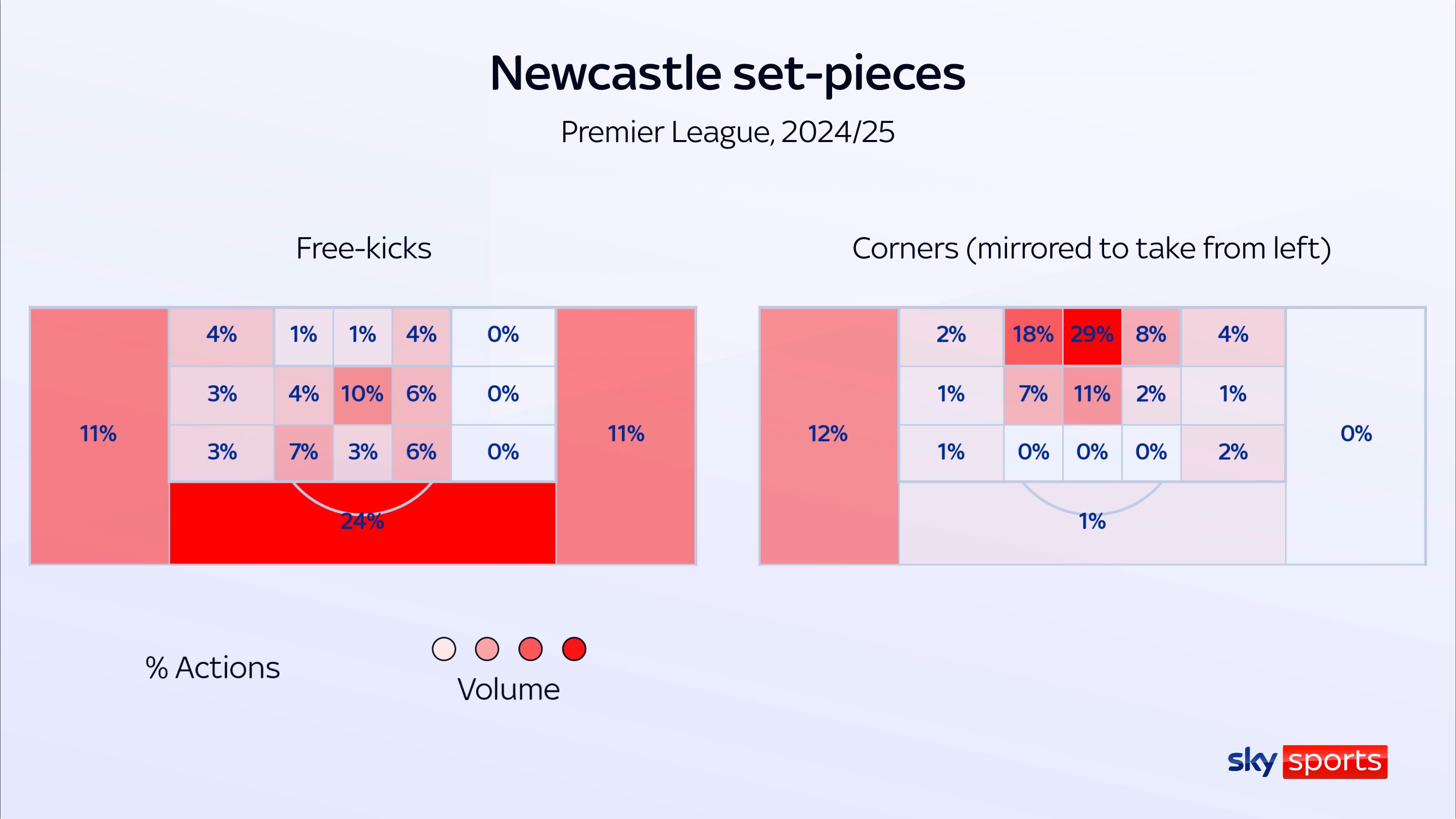Newcastle tend to fire corners onto the goalkeeper or the near post, with 12 per cent played short. The Magpies play a quarter of their free-kicks short, with another quarter played out to either channel.