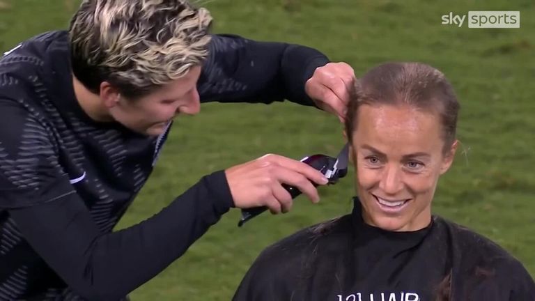 Australian star Aivi Luik shaves head on pitch for cancer charity