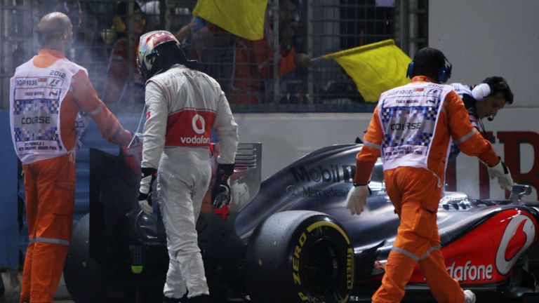 Image: In another iconic image of the season, Hamilton retired from the lead of the Singapore race. Days later, he announced his decision to join Mercedes. -