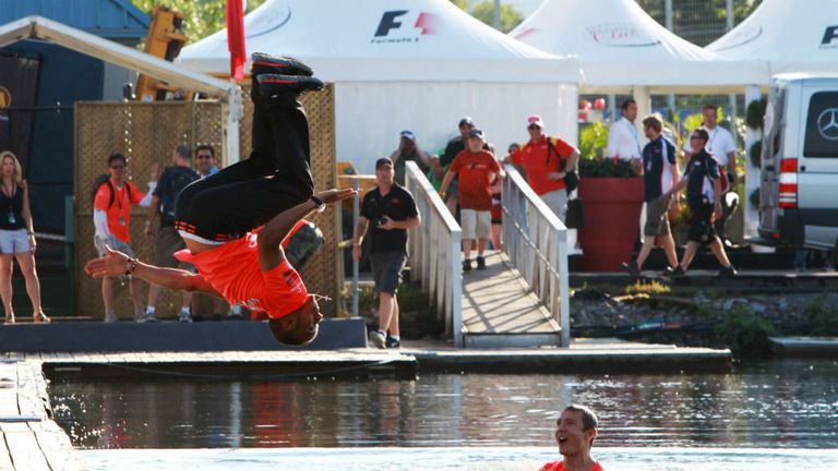 Image: Delighted with his Montreal win, Lewis Hamilton went for a victory swim -