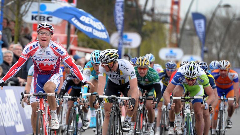 The Russian rider, who had been on the podium four times already this season without winning, was thrust into contention by his Katusha team-mates as a bunch sprint ensued in Koksijide and then kicked on to beat John Degenkolb (HTC-Highroad) and Peter Sagan (Liquigas) by a bike length at the line.