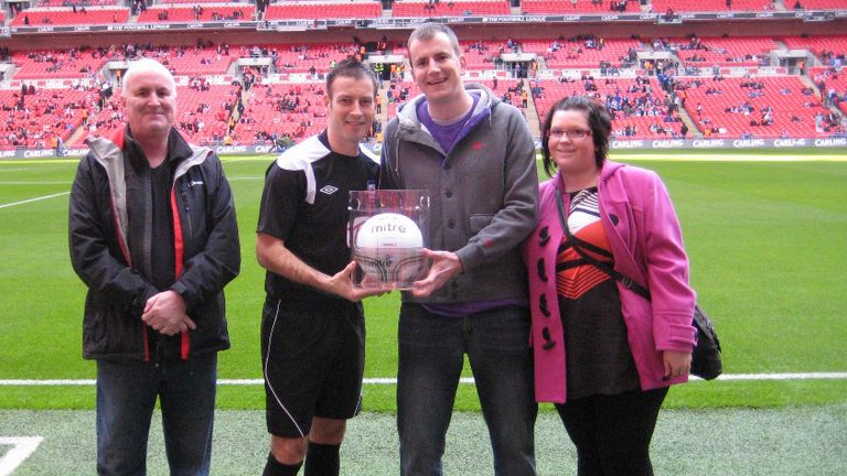 Adam, 26, from Cardiff, entered a competition on socceram.com and was selected from over 3,000 entrants to win the chance to present Carling Cup final referee Mark Clattenburg with the Mitre match ball on the pitch before the game along with tickets for him and two friends.