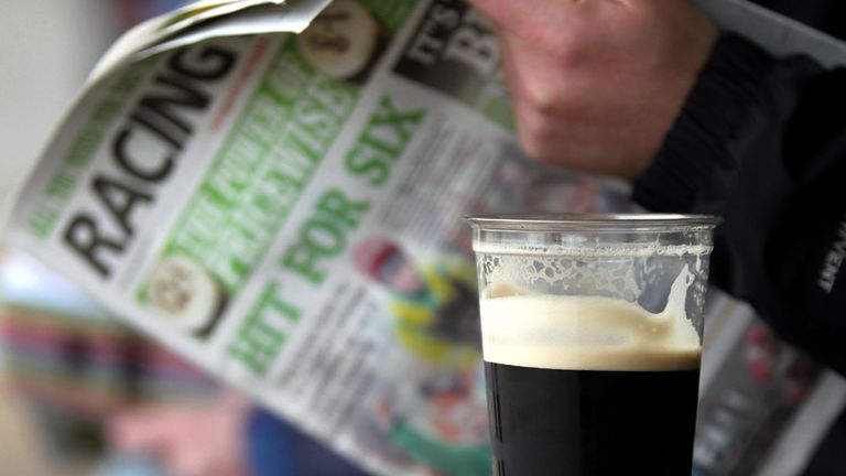 Image: A racegoer studys the form with a pint of Guinness. -