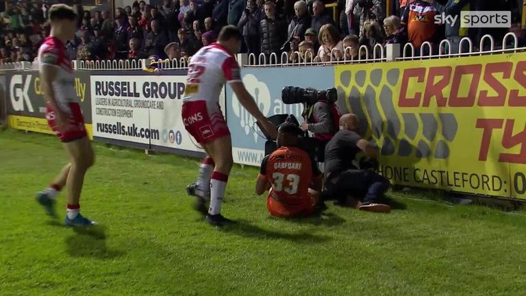 Super League: Cameraman gets caught in a tackle!