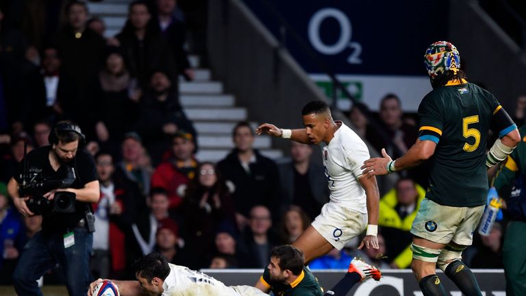 7. Jan Serfontein of South Africa dives over to score the opening try during the QBE Intenational match against England