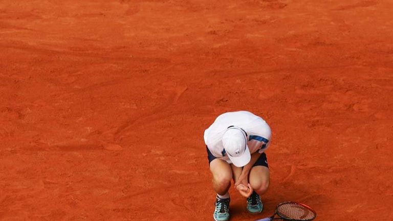Image: May: The defining moment of Murray's summer, as he sinks to his knees in pain after damaging his right wrist in Hamburg. -