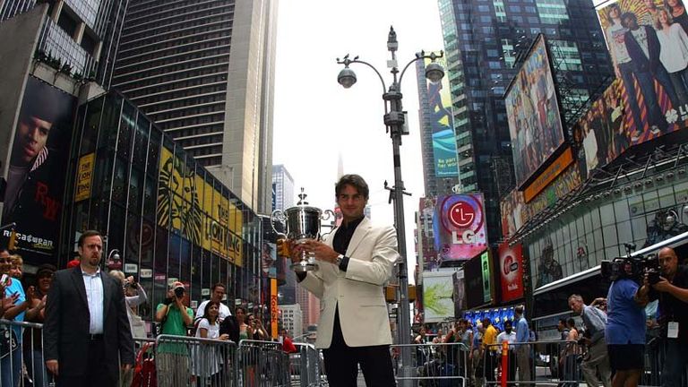 Image: September: Federer poses in Times Square after beating Djokovic to land his fourth US Open title in succession. -