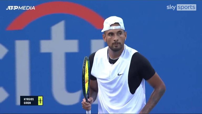 Nick Kyrgios beat American Marcos Giron on Tuesday, the Australian's first singles match since reaching the Wimbledon final.