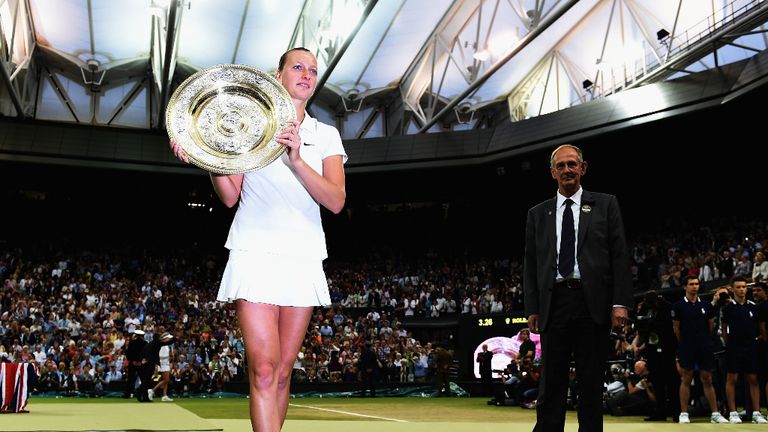 The 24-year-old Czech followed up her 2011 success by defeating Canadian Eugenie Bouchard 6-3 6-0 on Centre Court on Saturday to lift the Venus Rosewater Dish.