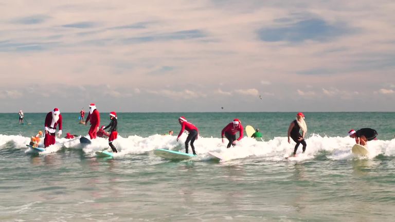 Thousands of spectators lined Florida's Cocoa Beach on Christmas Day to watch around 800 surfers of all abilities taking to the waves dressed as Father Christmas.