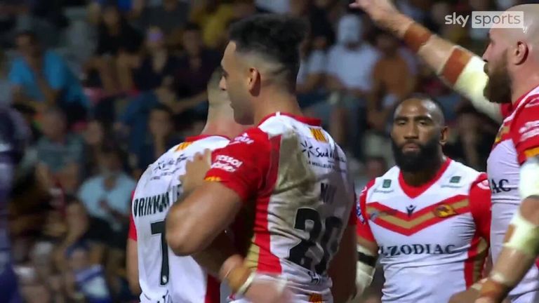 Tyrone May strikes as his kick bounces back for him to finish for the Dragons' fifth try of the night!