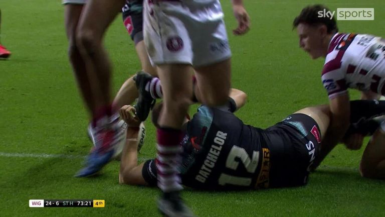 St Helens' Joe Batchelor crashed over but it was too little too late for the visitors versus Wigan.