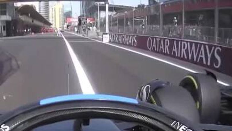 See how Mercedes driver George Russell and Aston Martin's Lance Stroll almost crashed into one another during Sunday's race at Baku City Circuit.