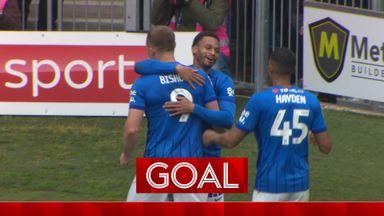 Colby Bishop taps in from close range in a busy penalty area to open the scoring for Portsmouth against Watford.